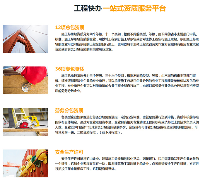 建筑工程施工总承包资质、市政公用工程总承包资质、通信工程施工总承包资质、电力工程施工总承包资质、机电工程施工总承包资质,资质提升与申报。